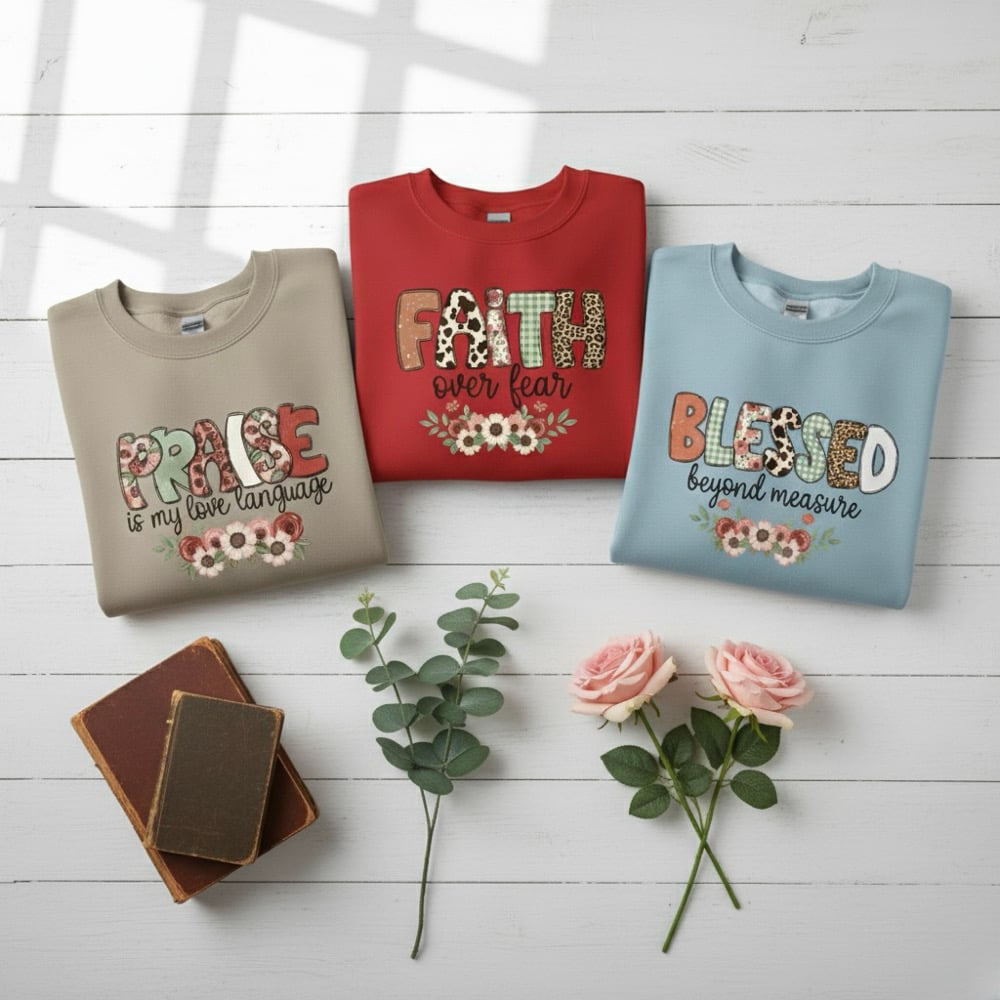 The Floral Faithful Expressions Collection bridges the gap between cozy comfort and a bold declaration of faith. We believe your apparel should mirror the beauty of your journey, using soft floral motifs to illustrate the power of Praise, Faith, and Blessings.